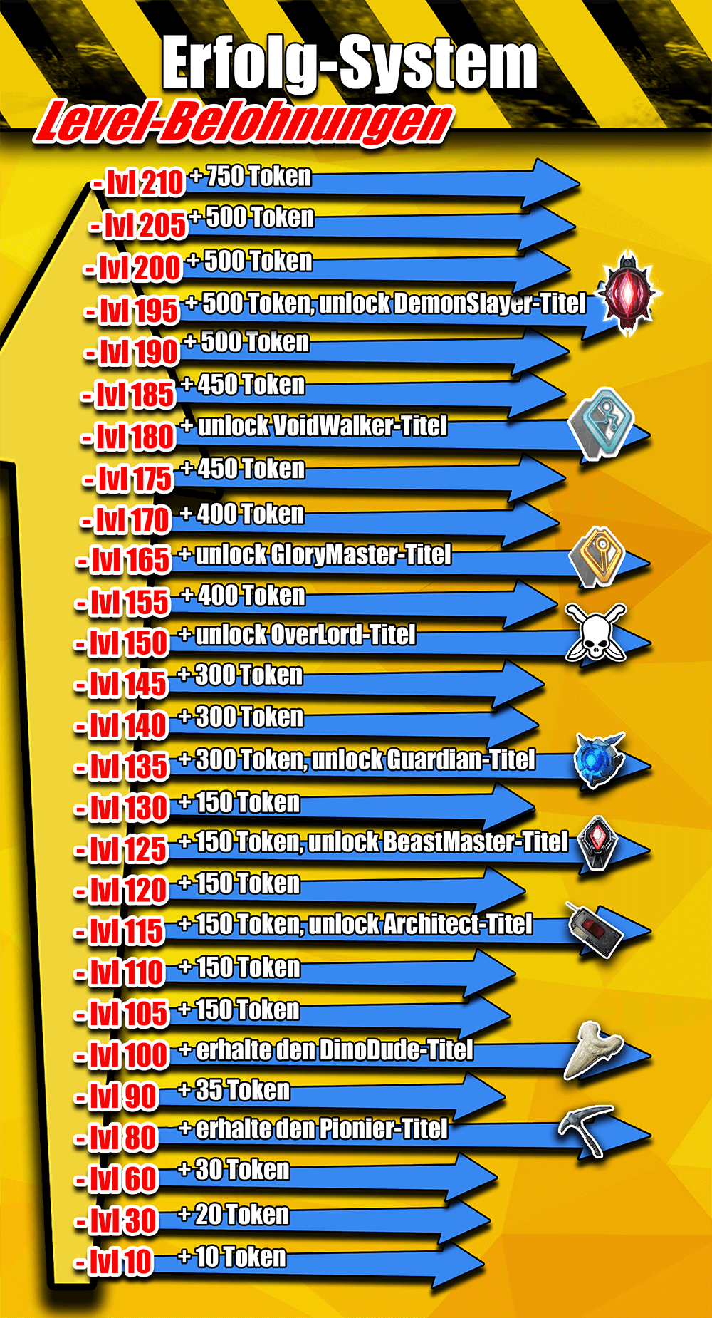 Das erweiterte Erfolg-System in ARK ASA belohnt Spieler nun für das Erreichen bestimmter Level mit speziellen Erfolgsbelohnungen, darunter neue Titel und Freischaltungen. Diese Anerkennungen dienen als Statussymbole und schalten besondere Vorteile frei. Mit zukünftigen Erweiterungen wird das System weiter wachsen, um eure Abenteuer noch spannender zu gestalten.